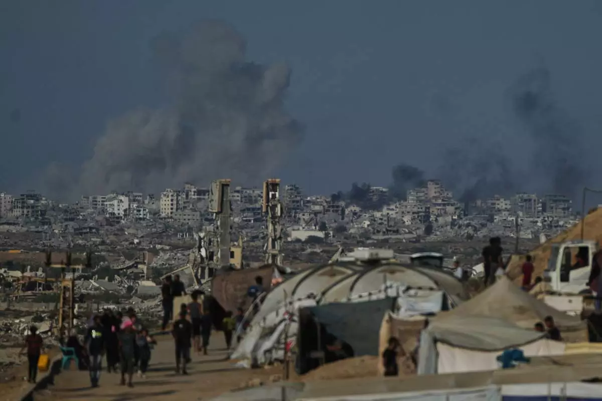 Smoke rises following an Israeli military strike in Gaza City as seen from the central Gaza Strip, Wednesday, Oct. 8, 2025. (AP Photo/Abdel Kareem Hana)