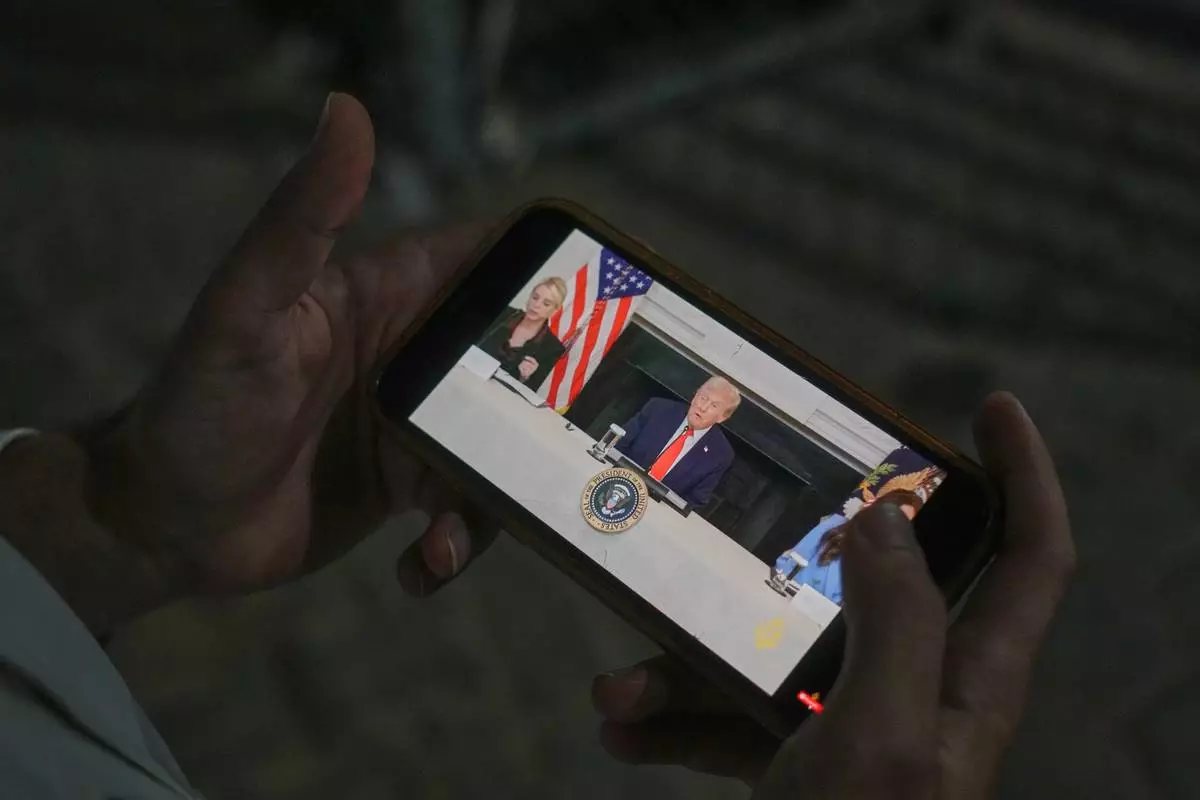 Palestinian paramedic Saeed Awad looks at his phone displaying an image of U.S. President Donald Trump, following the announcement that Israel and Hamas have agreed to the first phase of a peace plan to pause fighting, as he stands at Al-Aqsa Hospital, in Deir al-Balah, in the central Gaza Strip, Thursday, Oct. 9, 2025. (AP Photo/Abdel Kareem Hana)