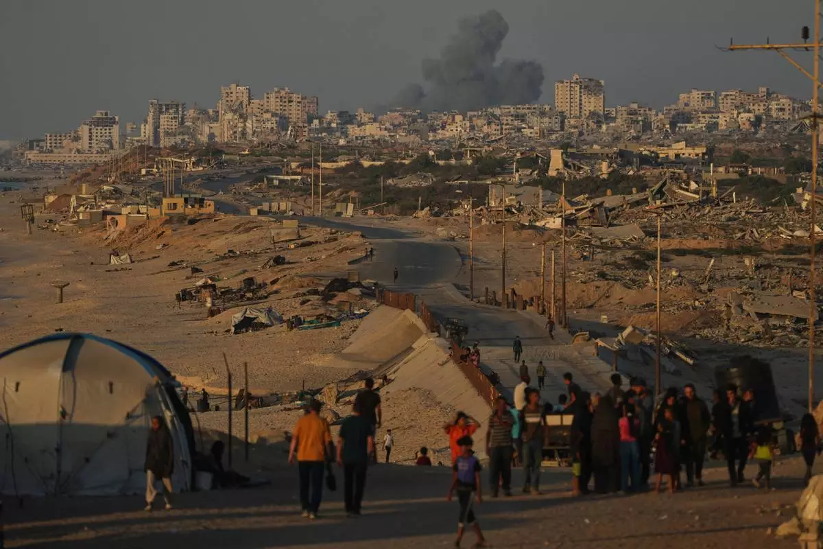 Displaced Palestinians walk along the coastal road, backdropped by smoke rising into the sky after an Israeli military strike in Gaza City, as seen from the central Gaza Strip, Wednesday, Oct. 8, 2025. (AP Photo/Abdel Kareem Hana)