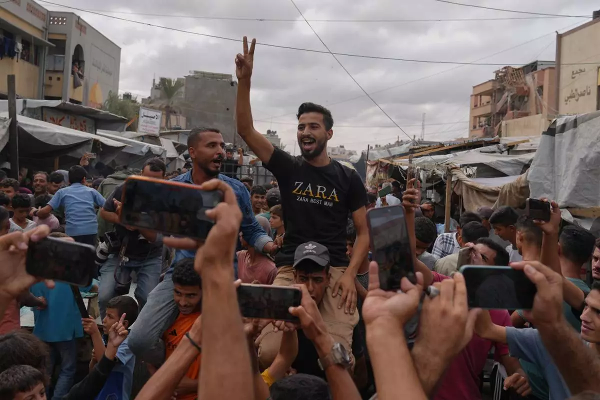 Palestinians celebrate following the announcement that Israel and Hamas have agreed to the first phase of a peace plan to pause the fighting, in Khan Younis, southern Gaza Strip, Thursday, Oct. 9, 2025. (AP Photo/Jehad Alshrafi)
