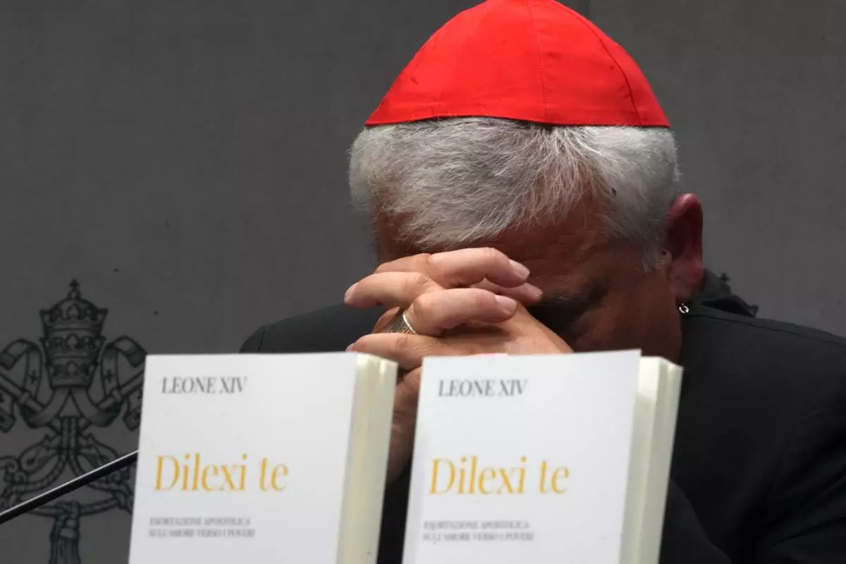 Cardinal Konrad Krajewski attends a press conference at the Vatican to present Pope Leo XIV's exhortation "Dilexi te"about love for the poor, Thursday, Oct. 9, 2025. (AP Photo/Domenico Stinellis)
