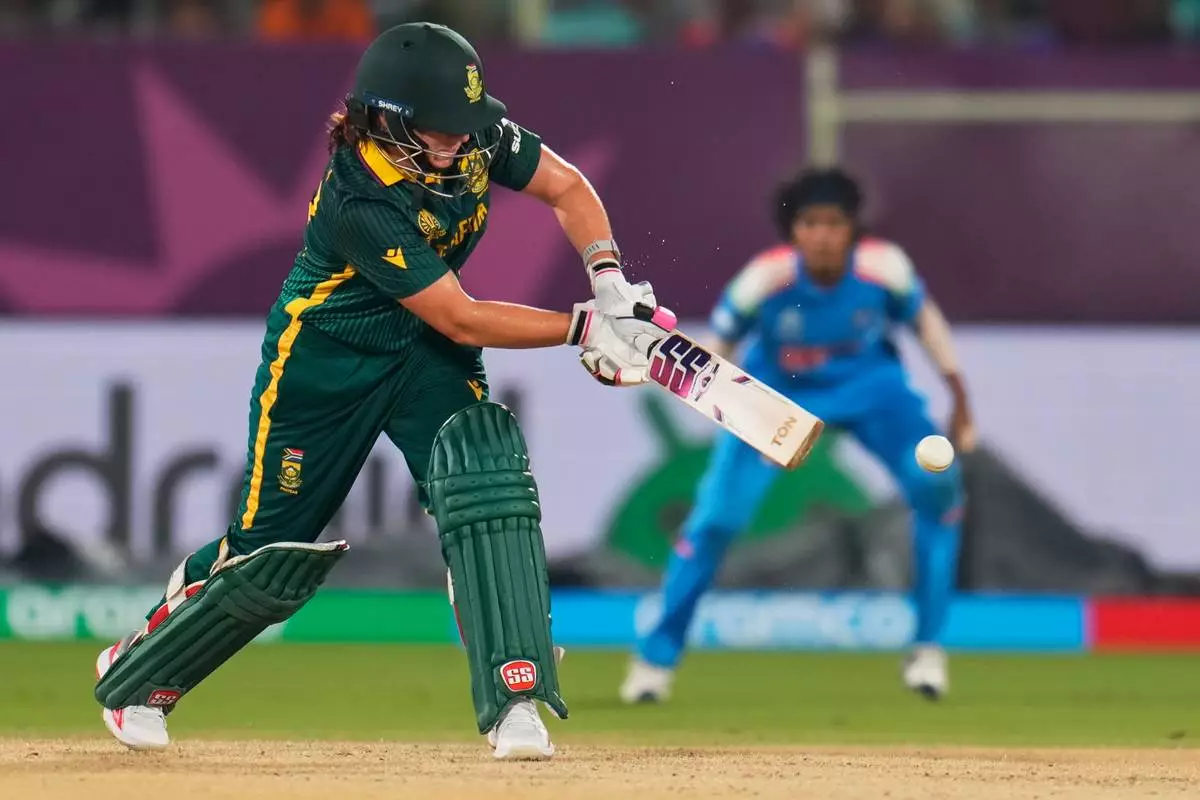 South Africa's Chole Tryon plays a shot during the ICC Women's Cricket World Cup match between India and South Africa at ACA-VDCA Cricket Stadium in Visakhapatnam, India, Thursday, Oct. 9, 2025. (AP Photo/Aijaz Rahi)