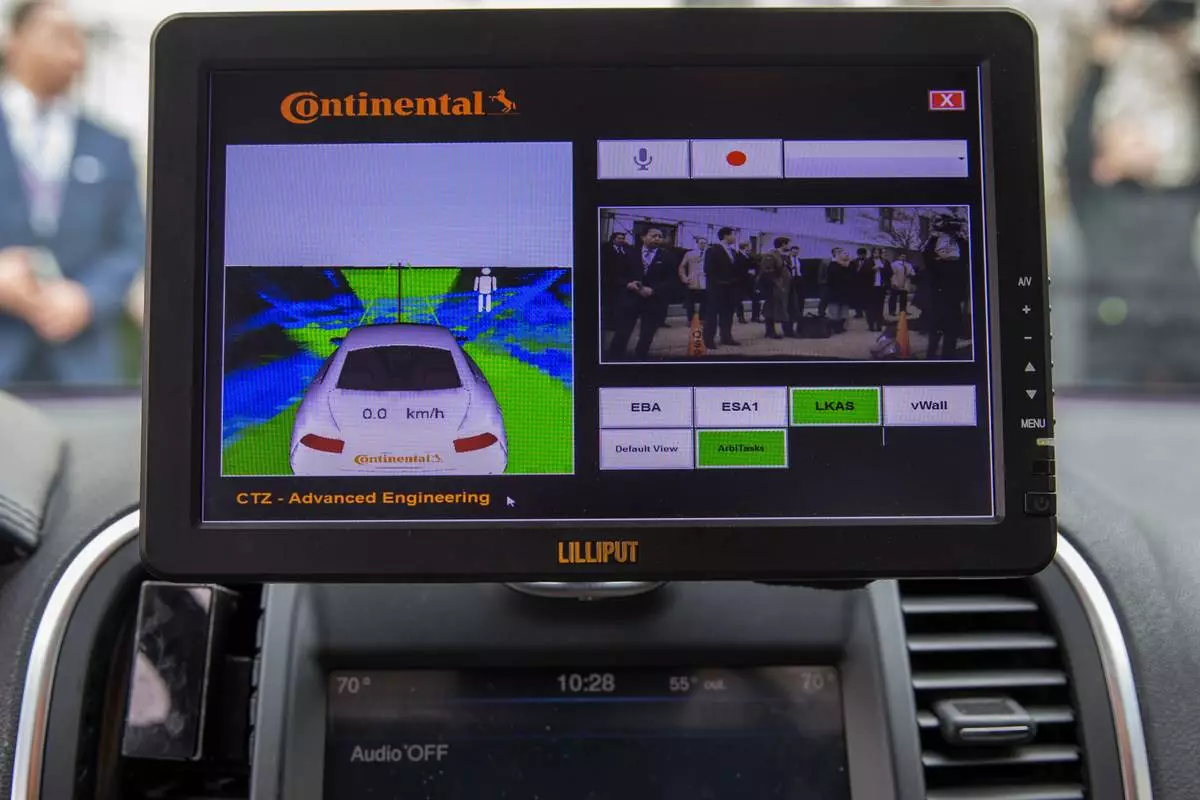 FILE - A display inside a Tesla Model 90D during a demonstration of self driving car technology on Capitol Hill, on March 15, 2016, in Washington. (AP Photo/Evan Vucci, file)