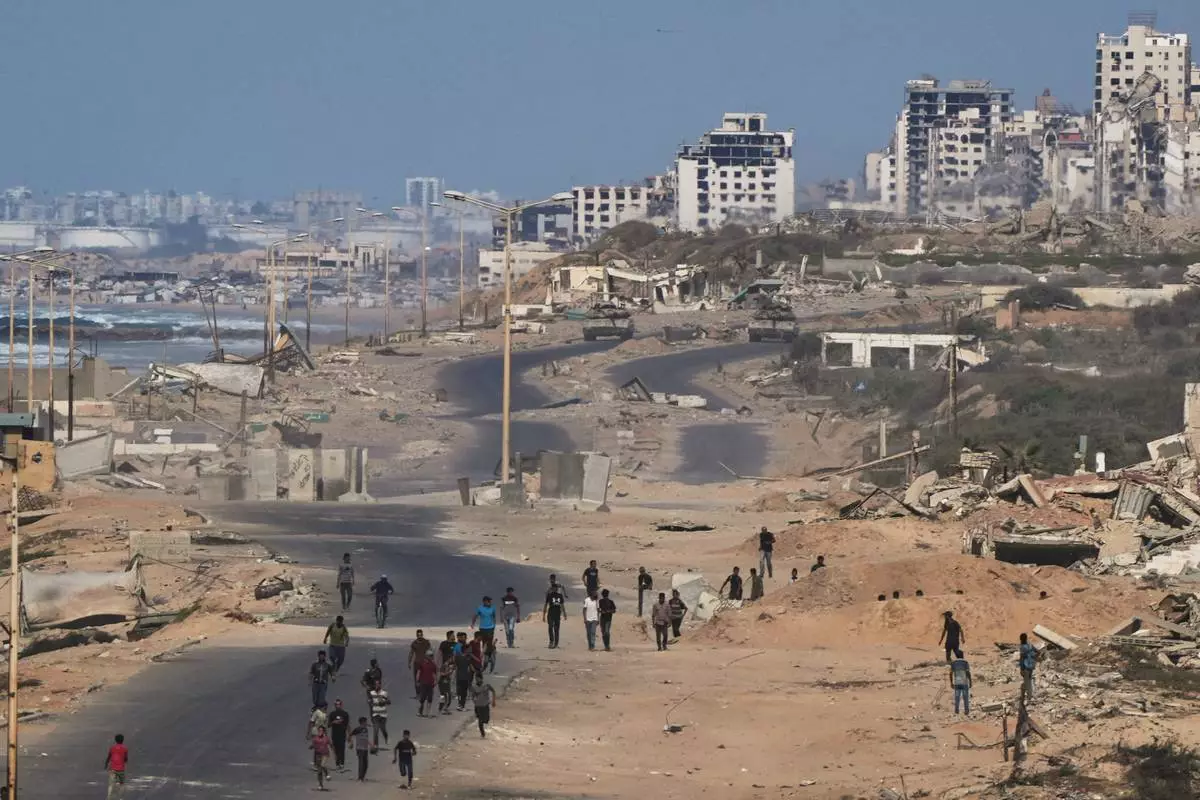 Israeli tanks block the beach road to Gaza City as displaced Palestinians gather on the coastal road near Wadi Gaza after the announcement that Israel and Hamas had agreed to the first phase of a peace plan to pause the fighting, in the central Gaza Strip, Thursday, Oct. 9, 2025. (AP Photo/Abdel Kareem Hana)