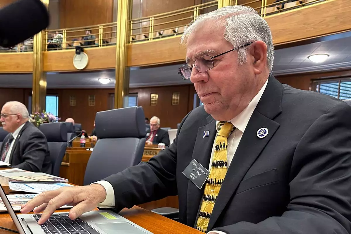 FILE - North Dakota Republican state Rep. Bill Tveit works at his desk, Jan. 22, 2025, in the House of Representatives at the state Capitol in Bismarck, N.D. (AP Photo/Jack Dura, File)