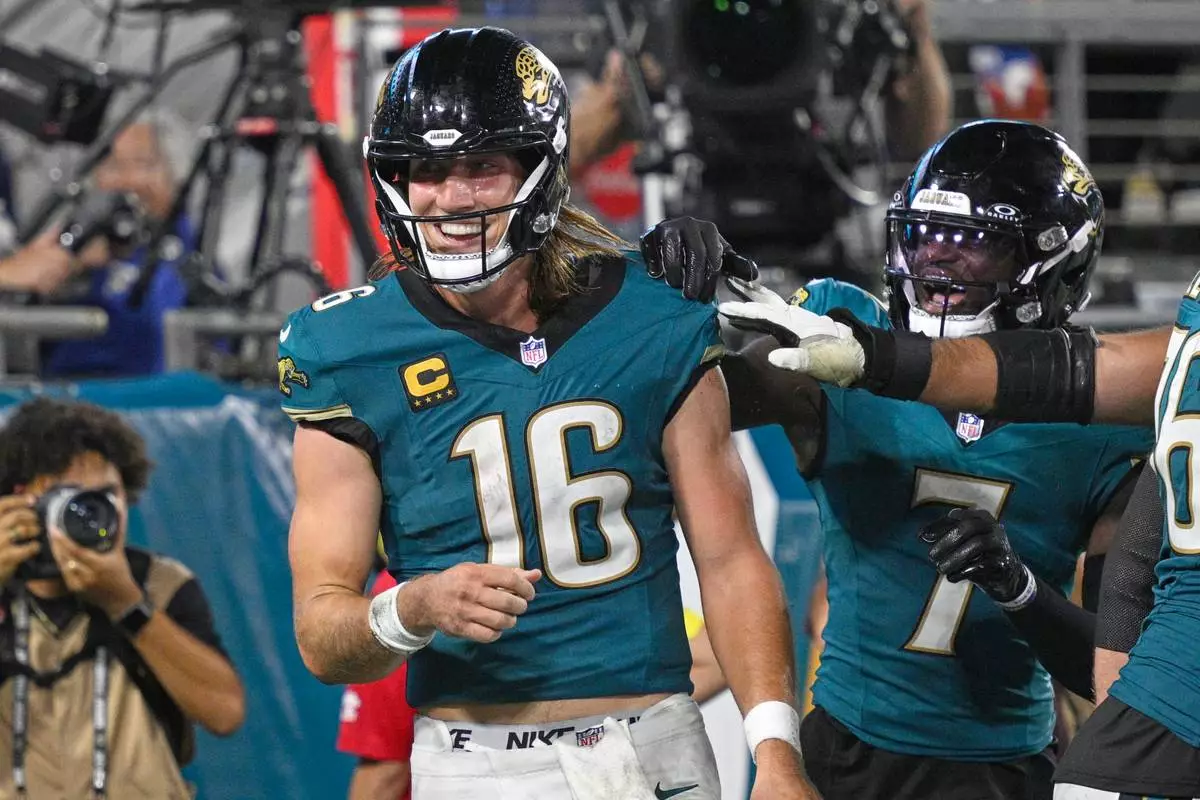 Jacksonville Jaguars quarterback Trevor Lawrence (16) celebrates with teammates after scoring a touchdown during the second half of an NFL football game against the Kansas City Chiefs, Monday, Oct. 6, 2025, in Jacksonville, Fla. (AP Photo/Phelan M. Ebenhack)