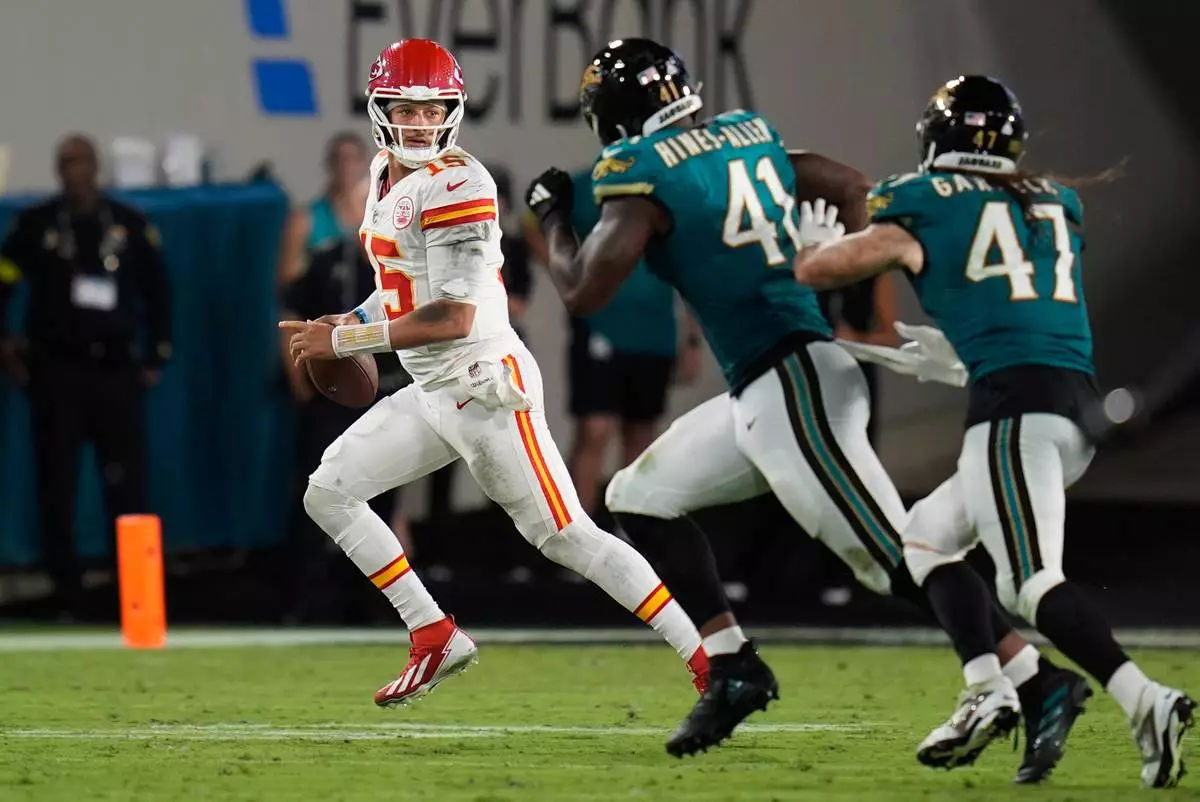 Kansas City Chiefs quarterback Patrick Mahomes (15) looks to pass under pressure from Jacksonville Jaguars defensive end Josh Hines-Allen (41) during the first half of an NFL football game, Monday, Oct. 6, 2025, in Jacksonville, Fla. (AP Photo/John Raoux)