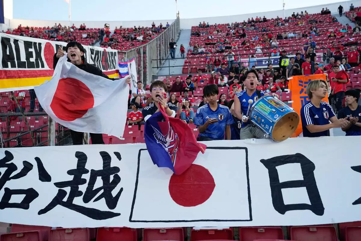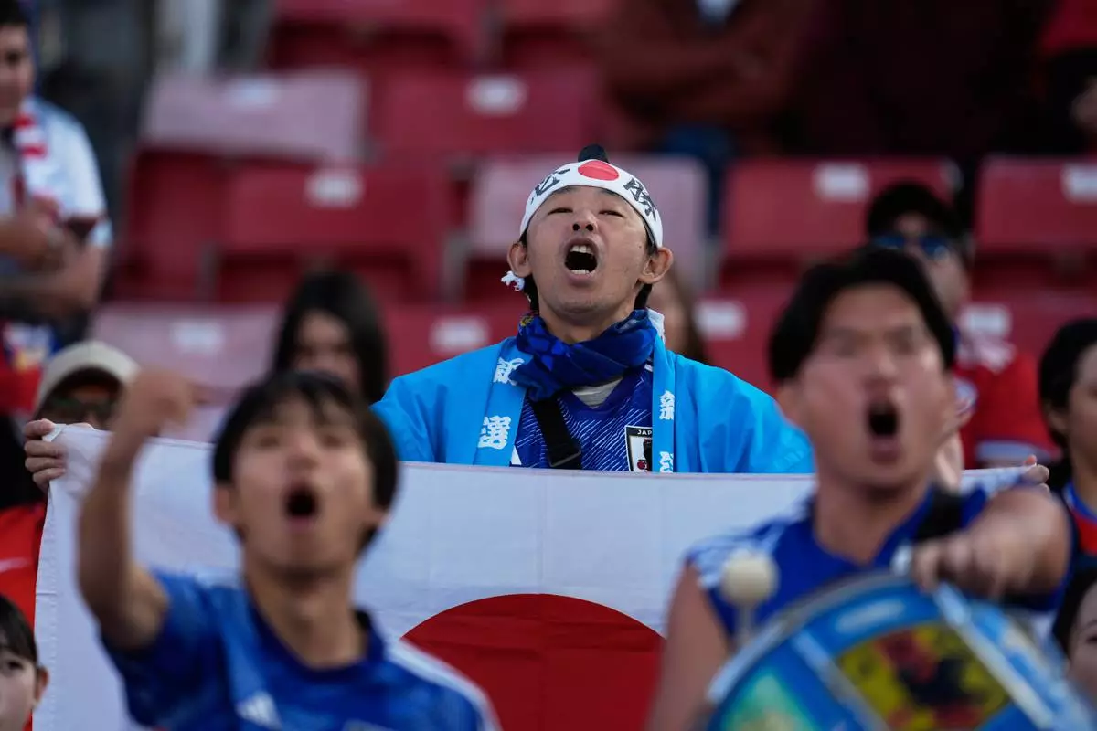 Fans of Japan attend a FIFA U-20 World Cup Group A soccer match between Japan and Egypt at National Stadium in Santiago, Chile, Saturday, Sept. 27, 2025. (AP Photo/Esteban Felix)