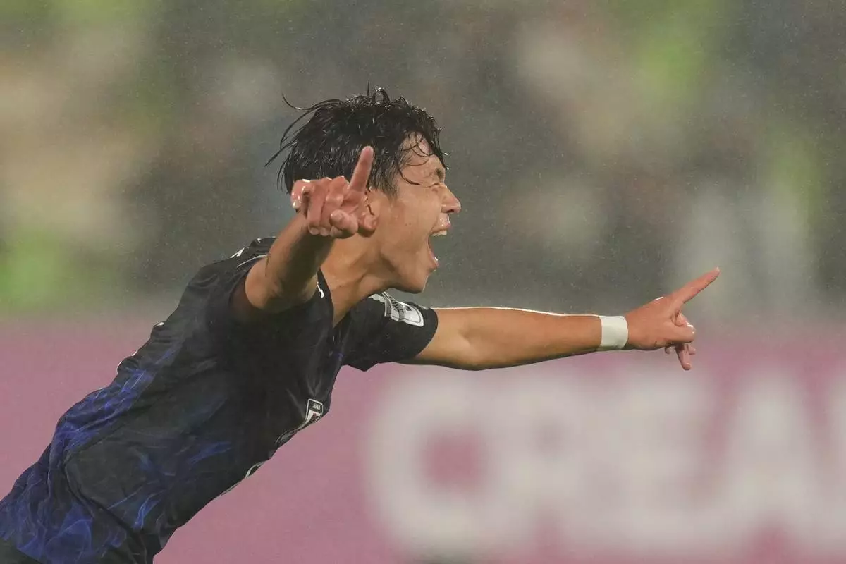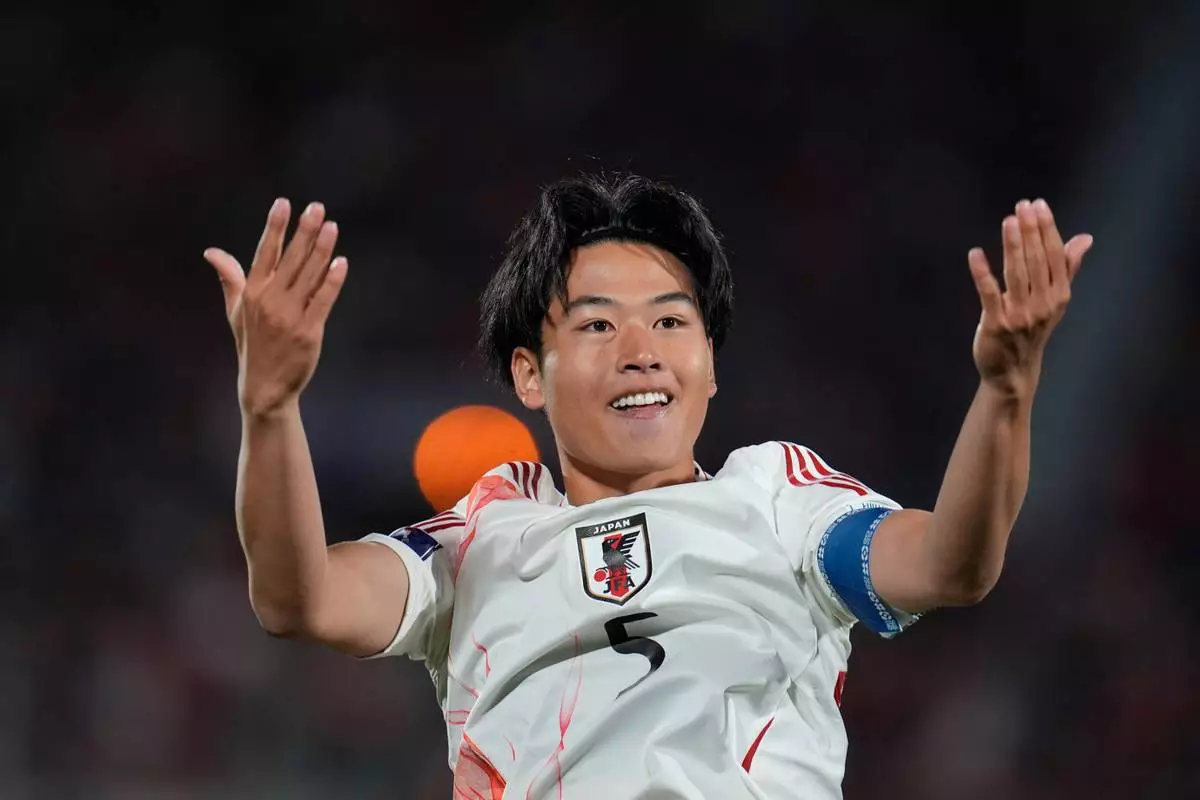 Japan's Kosei Ogura celebrates scoring his side's opening goal against New Zealand during a FIFA U-20 World Cup Group A soccer match at Elias Figueroa Brander Stadium in Valparaiso, Chile, Friday, Oct. 3, 2025. (AP Photo/Andre Penner)