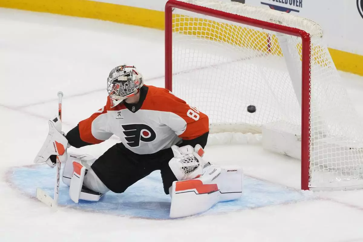 Philadelphia Flyers goaltender Dan Vladar (80) stops a shot by Florida Panthers left wing Brad Marchand (63) during the second period of an NHL hockey game, Thursday, Oct. 9, 2025, in Sunrise, Fla. (AP Photo/Marta Lavandier)