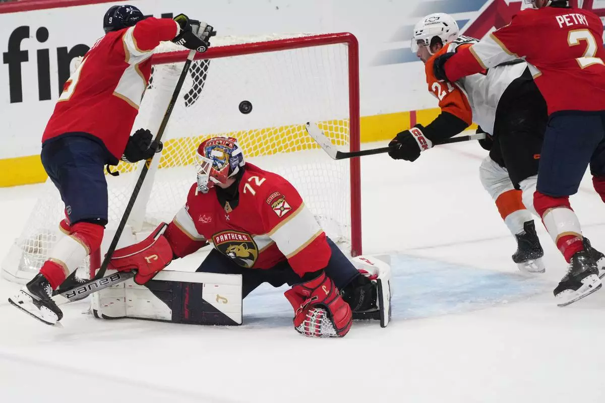 Florida Panthers center Anton Lundell scores a goal against Philadelphia Flyers goaltender Dan Vladar (80) during the second period of an NHL hockey game, Thursday, Oct. 9, 2025, in Sunrise, Fla. (AP Photo/Marta Lavandier)