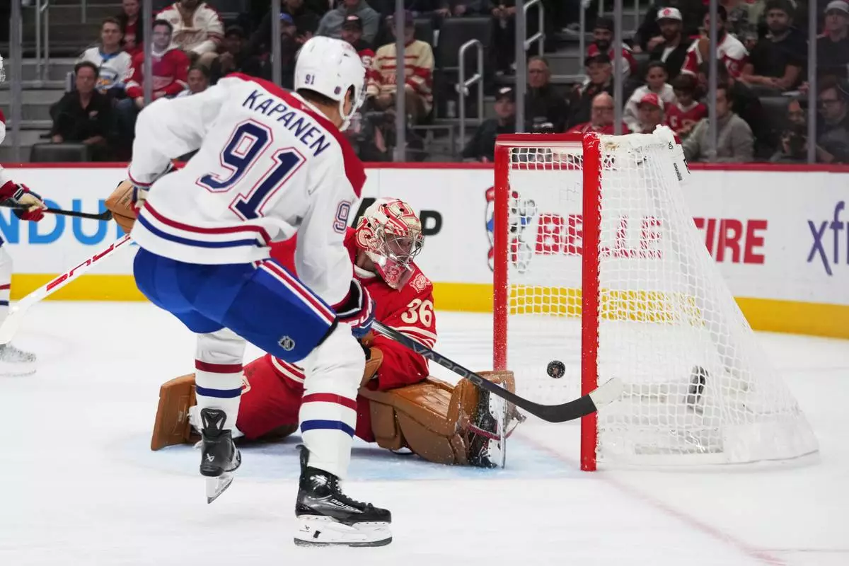 Montreal Canadiens center Oliver Kapanen (91) scores on Detroit Red Wings goalie John Gibson (36) in the first period of an NHL hockey game Thursday, Oct. 9, 2025, in Detroit. (AP Photo/Paul Sancya)