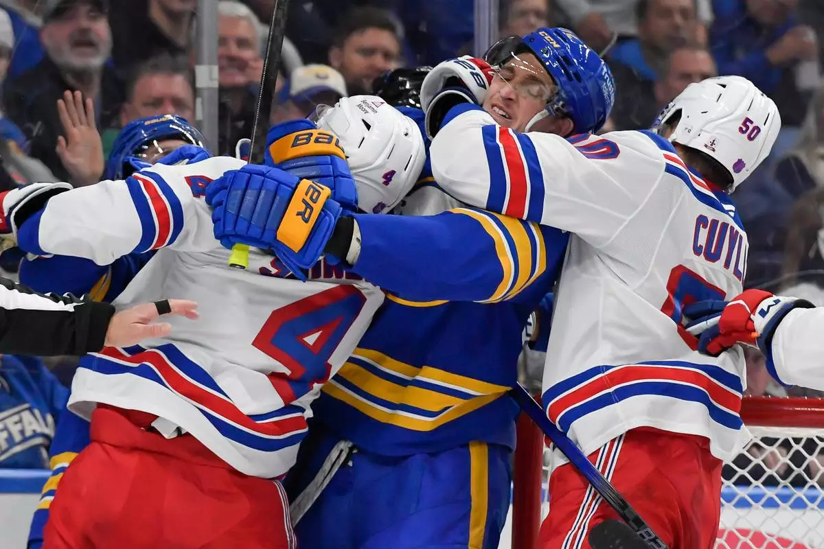 Buffalo Sabres center Tage Thompson, second from right, is held by New York Rangers left wing Will Cuylle (50) as players scuffle after the whistle during the second period of an NHL hockey game in Buffalo, N.Y., Thursday, Oct. 9, 2025. (AP Photo/Adrian Kraus)