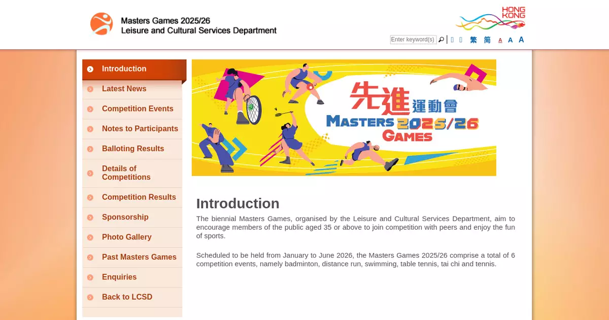 The Leisure and Cultural Services Department (LCSD) will hold the Masters Games 2025/26 to encourage members of the public aged 35 or above to join competitions with peers and enjoy the fun of sports. Enrolment for different events will open from mid-October in stages.