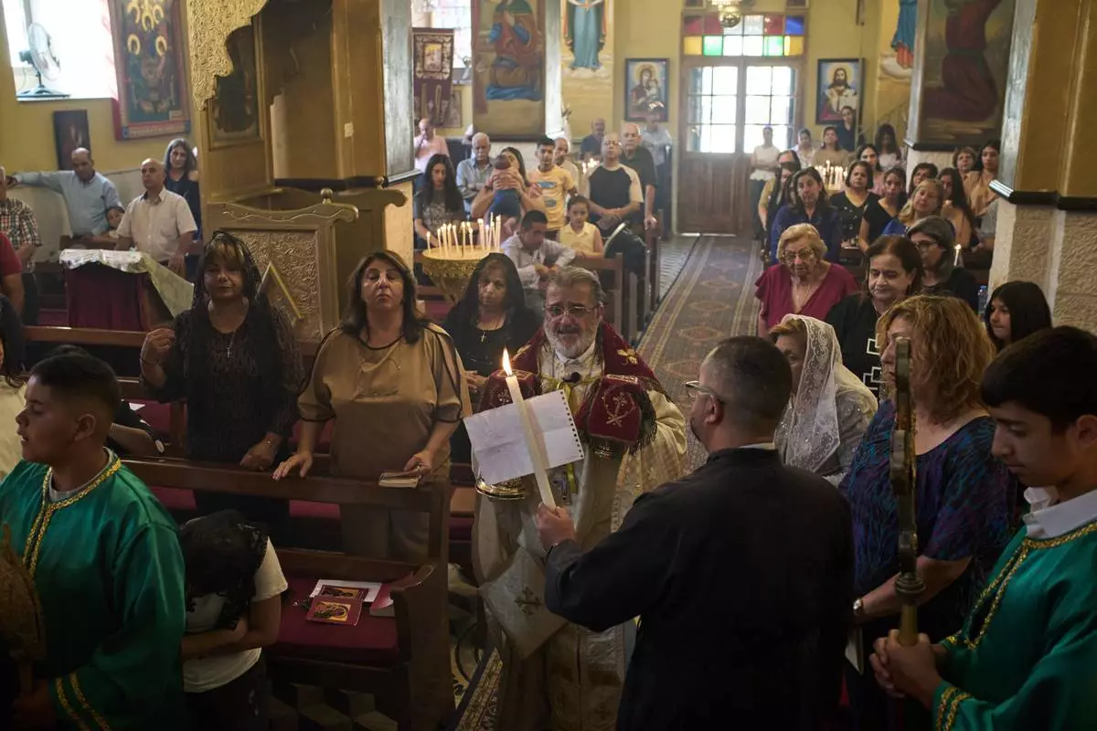 Greek Orthodox parish priest David Khoury attends morning Mass at St. George church in the West Bank village of Taybeh, Sept. 28, 2025. (AP Photo/Leo Correa)