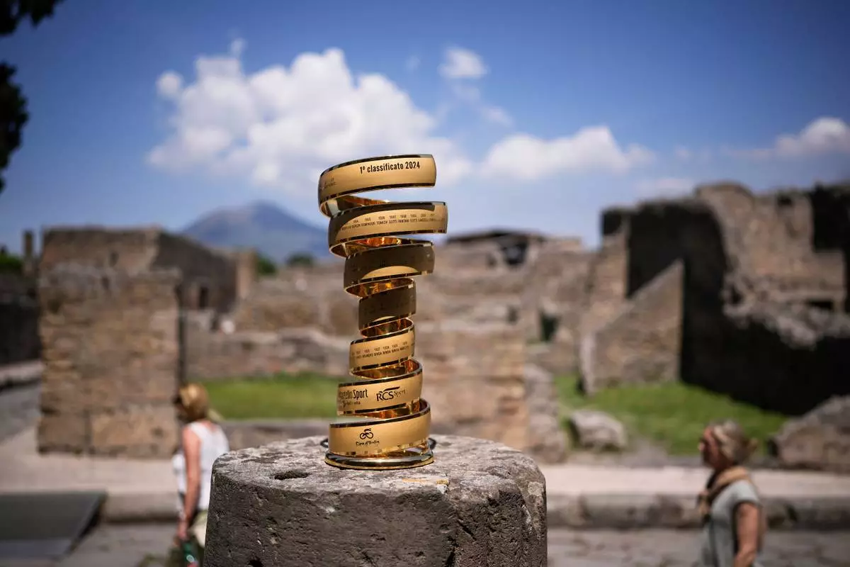 The Giro d'Italia trophy is displayed at the archaeological area of Pompeii, Italy, May 13, 2024. (Marco Alpozzi/LaPresse via AP)