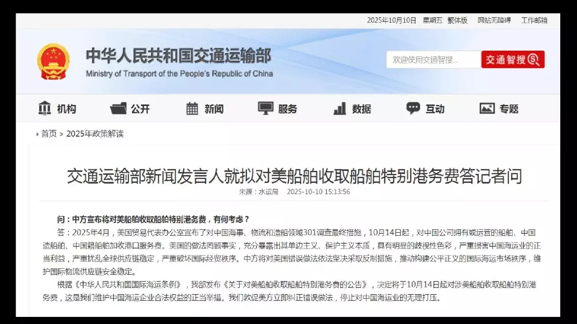 China's Ministry of Transport announced Friday that the country will charge special port fees on ships owned or operated by U.S. enterprises, organizations and individuals starting Oct. 14.