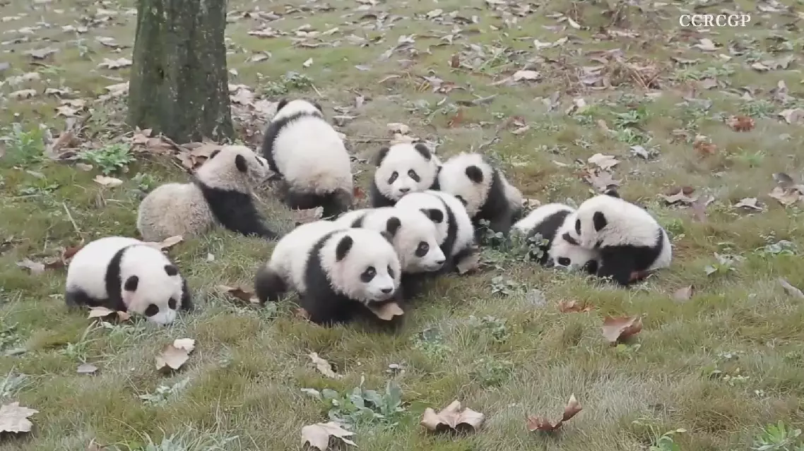 A group of giant panda cubs was recently caught on camera, playfully frolicking and crawling on the soft grass as they explored the world with their tiny paws at a panda base in southwest China.