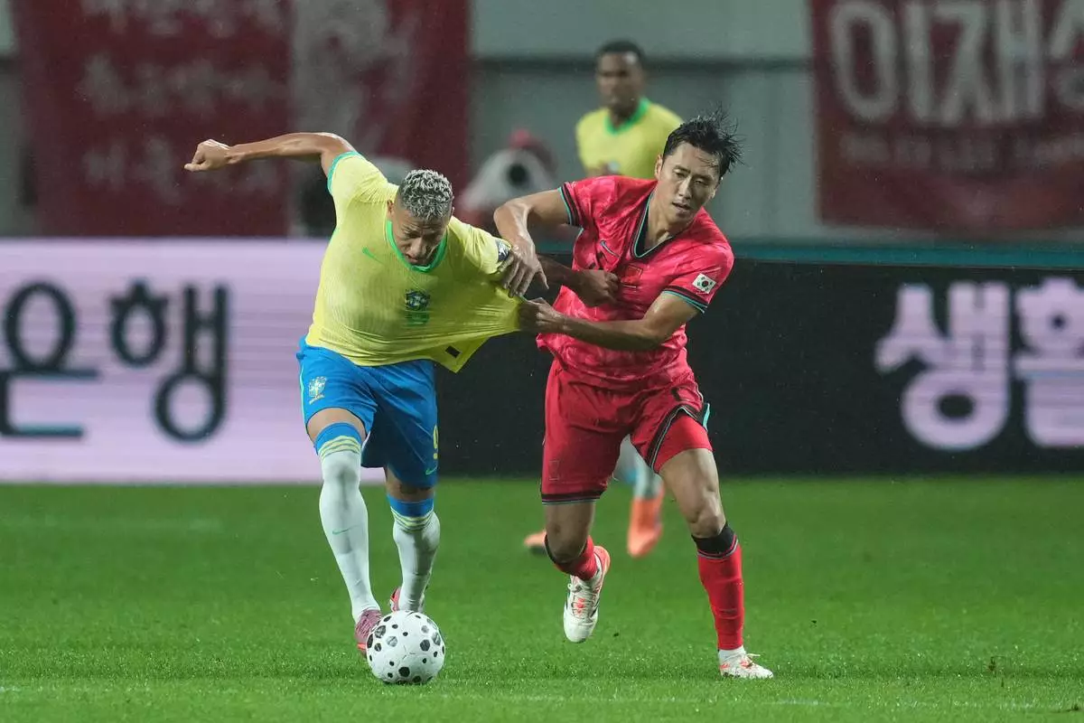 Brazil's Richarlison, left, and South Korea's Won Du-jae fight for the ball during the international friendly soccer match between South Korea and Brazil at Seoul World Cup Stadium in Seoul, South Korea, Friday, Oct. 10, 2025. (AP Photo/Lee Jin-man)