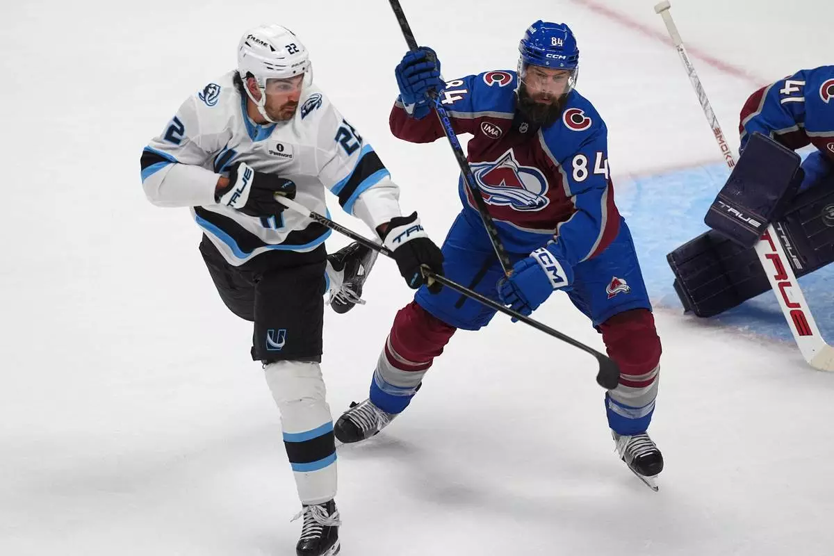 Utah Mammoth center Jack McBain, left, shoots the puck past Colorado Avalanche defenseman Brent Burns in the third period of an NHL hockey game Thursday, Oct. 9, 2025, in Denver. (AP Photo/David Zalubowski)