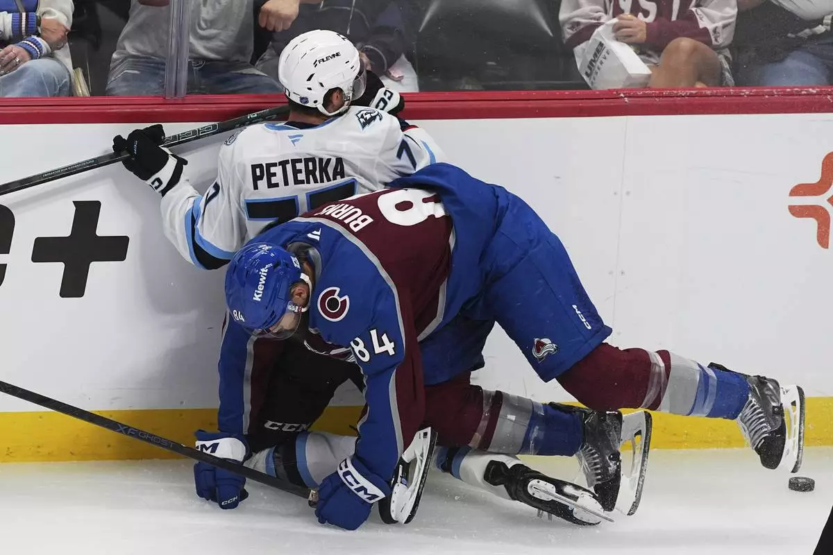 Colorado Avalanche defenseman Brent Burns (84) checks Utah Mammoth right wing JJ Peterka, back, in the third period of an NHL hockey game Thursday, Oct. 9, 2025, in Denver. (AP Photo/David Zalubowski)