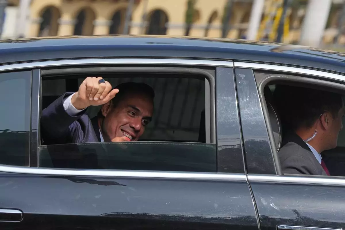 Peru's interim President Jose Jeri wave to the press as he arrives at the government palace in Lima, Peru, Friday, Oct. 10, 2025. (AP Photo/Guadalupe Pardo)