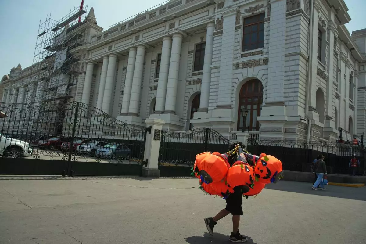 A vendor carries Halloween-themed pumpkin piñatas past Congress in Lima, Peru, Friday, Oct. 10, 2025, the day lawmakers voted to remove President Dina Boluarte from office. (AP Photo/Guadalupe Pardo)