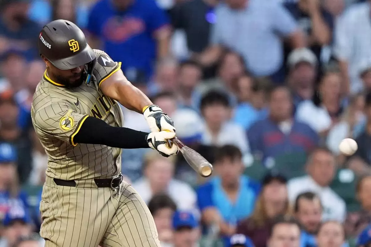 San Diego Padres' Xander Bogaerts hits a single during the seventh inning of Game 3 of a National League wild card baseball game against the Chicago Cubs Thursday, Oct. 2, 2025, in Chicago. (AP Photo/Nam Huh)