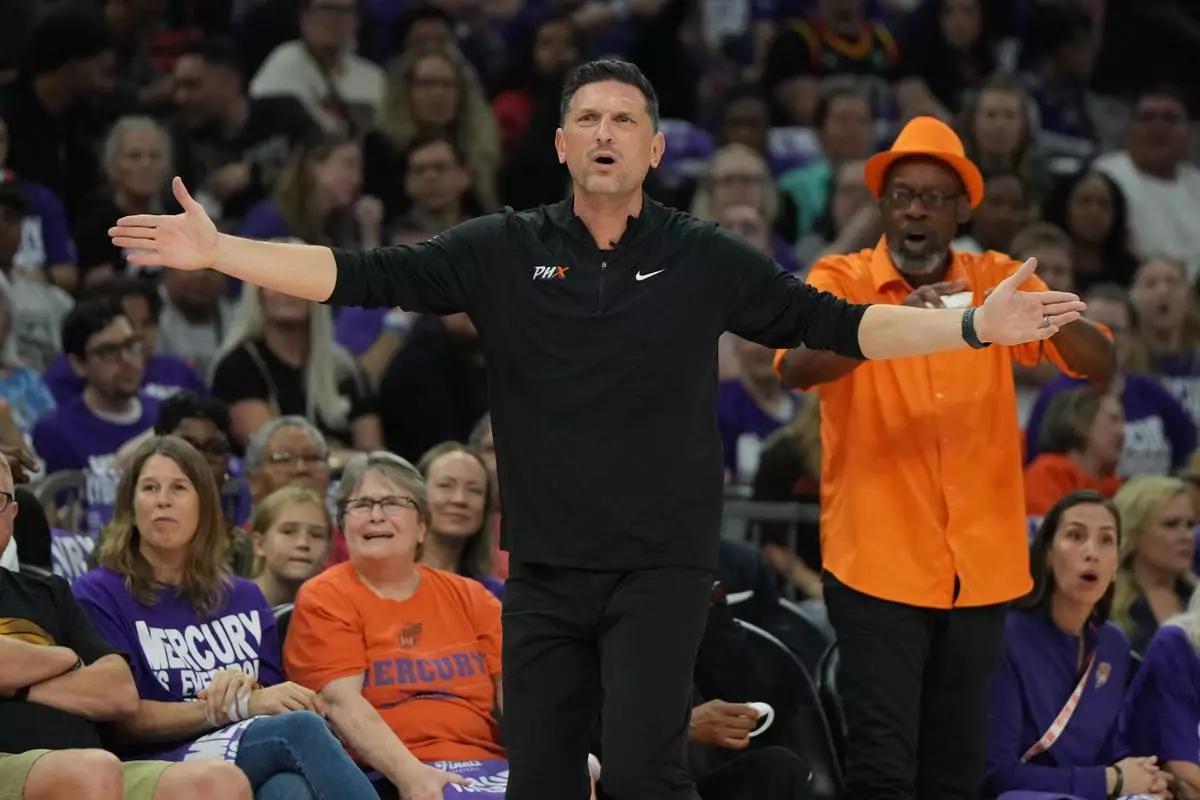 Phoenix Mercury head coach Nate Tibbetts reacts after a foul call against the Las Vegas Aces during the first half of Game 4 of the WNBA basketball finals, Friday, Oct. 10, 2025, in Phoenix. (AP Photo/Rick Scuteri)