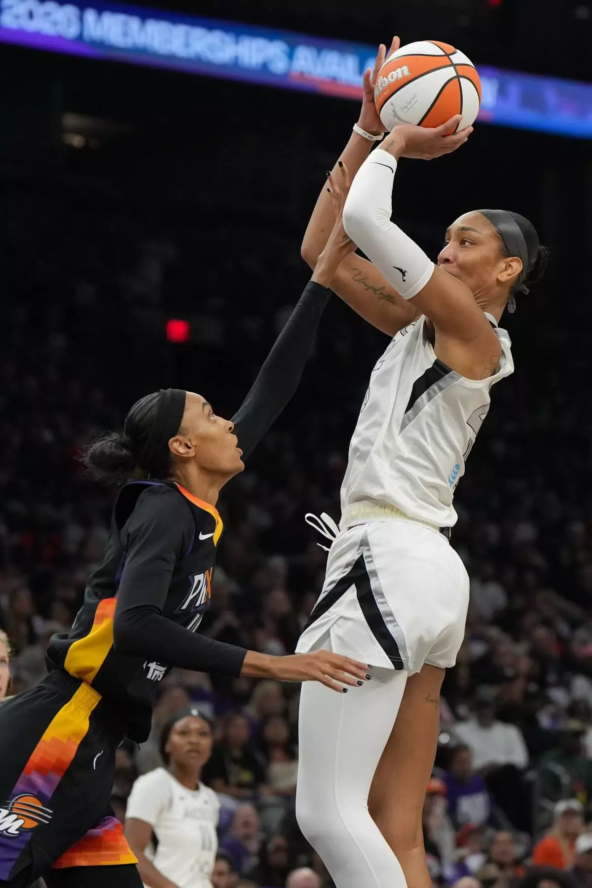 Las Vegas Aces center A'ja Wilson, right, looks to shoot over Phoenix Mercury forward DeWanna Bonner, left, during the first half of Game 4 of the WNBA basketball finals, Friday, Oct. 10, 2025, in Phoenix. (AP Photo/Rick Scuteri)
