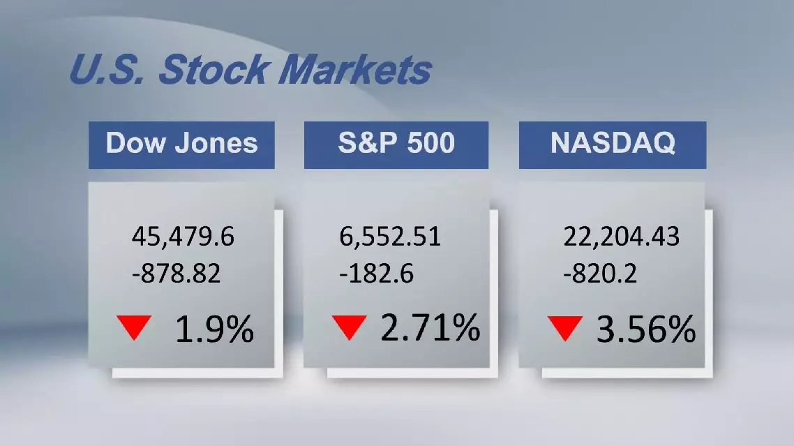The Dow Jones Industrial Average fell 878.82 points, or 1.9 percent, to 45,479.6. The Standard and Poor's 500 sank 182.6 points, or 2.71 percent, to 6,552.51. The Nasdaq Composite Index shed 820.2 points, or 3.56 percent, to close at 22,204.43.