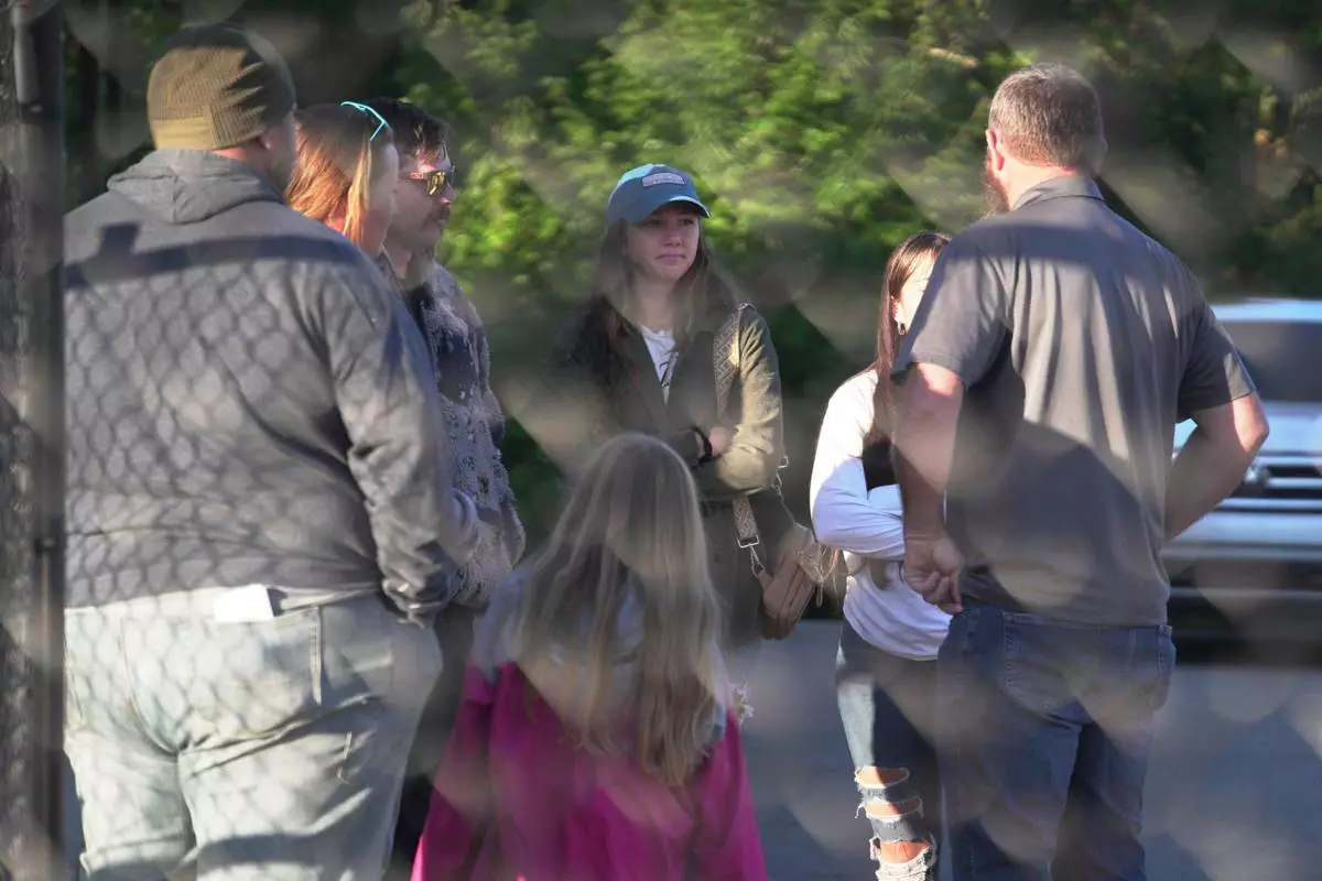 Family members gather at Accurate Energetic Systems, an explosive plant, after a blast on Friday resulted in multiple fatalities and several missing on Saturday, Oct 11, 2025, in Bucksnort, Tenn. (AP photo/ Obed Lamy)