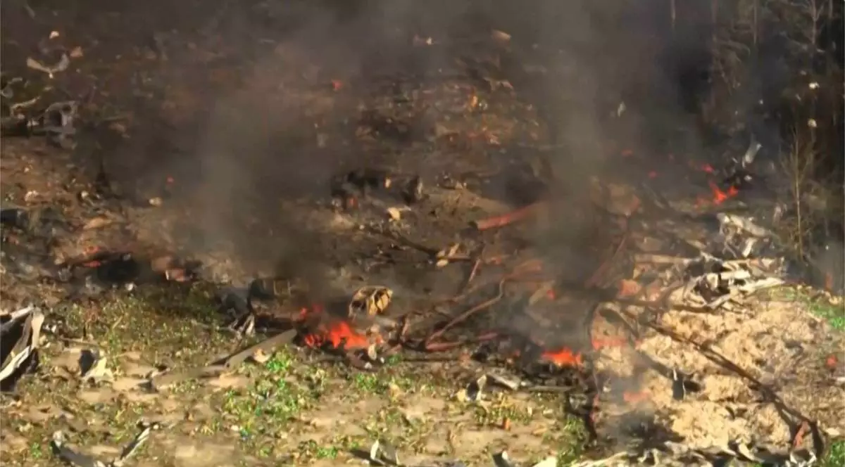 Smoke fills the air as debris covers the ground and vehicles after a powerful blast ripped through a military explosives manufacturing plant in Hickman County, Tenn., on Friday, Oct. 10, 2025. (WTVF-TV via AP)