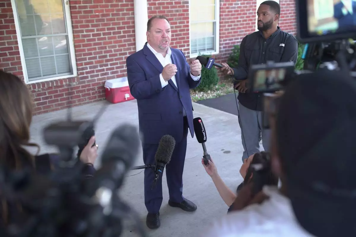 Tim Farris, Hurricane Chapel senior pastor, speaks to the press after a vigil at his church in McEwen, Tenn., on Saturday, Oct. 11, 2025, for victims of a blast that leveled an explosives plant. (AP Photo/Obed Lamy)