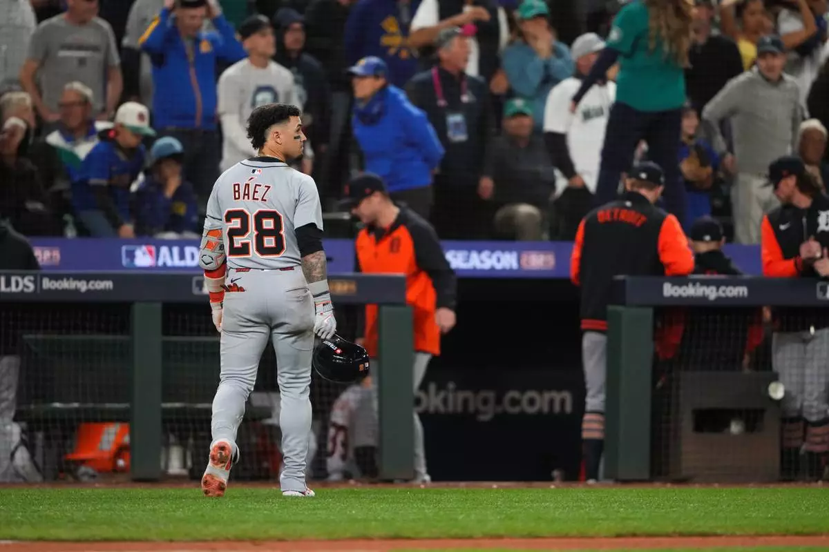 Detroit Tigers center fielder Javier Báez (28) walks to the dugout after popping out to end the top of the 14th inning in Game 5 of baseball's American League Division Series against the Seattle Mariners, Friday, Oct. 10, 2025, in Seattle. (AP Photo/Lindsey Wasson)