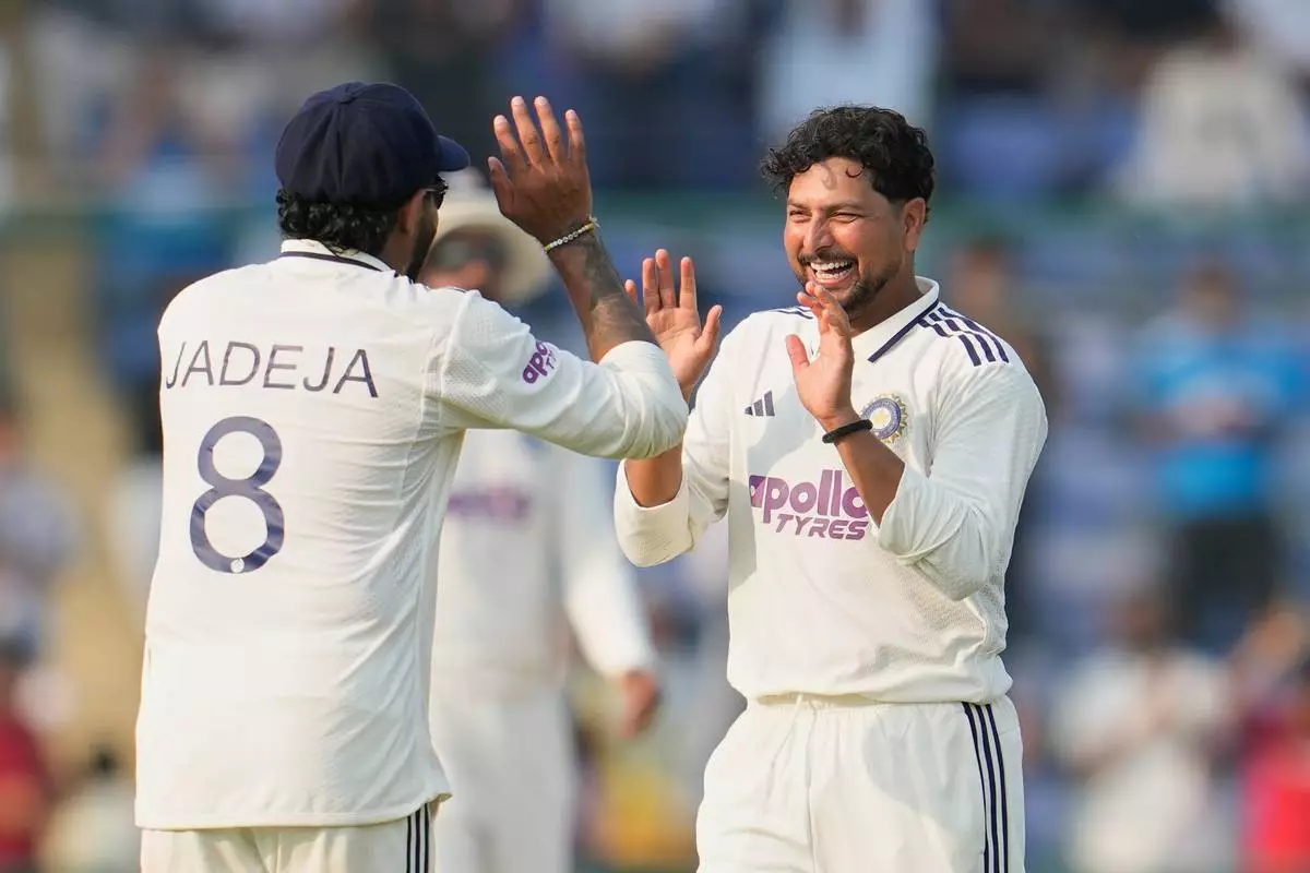 India's Kuldeep Yadav and Ravindra Jadeja celebrate the dismissal of West Indies' Alick Athanaze on the second day of the second cricket test match between India and West Indies at the Arun Jaitley Stadium in New Delhi, India, Saturday, Oct.11, 2025. (AP Photo/Manish Swarup)