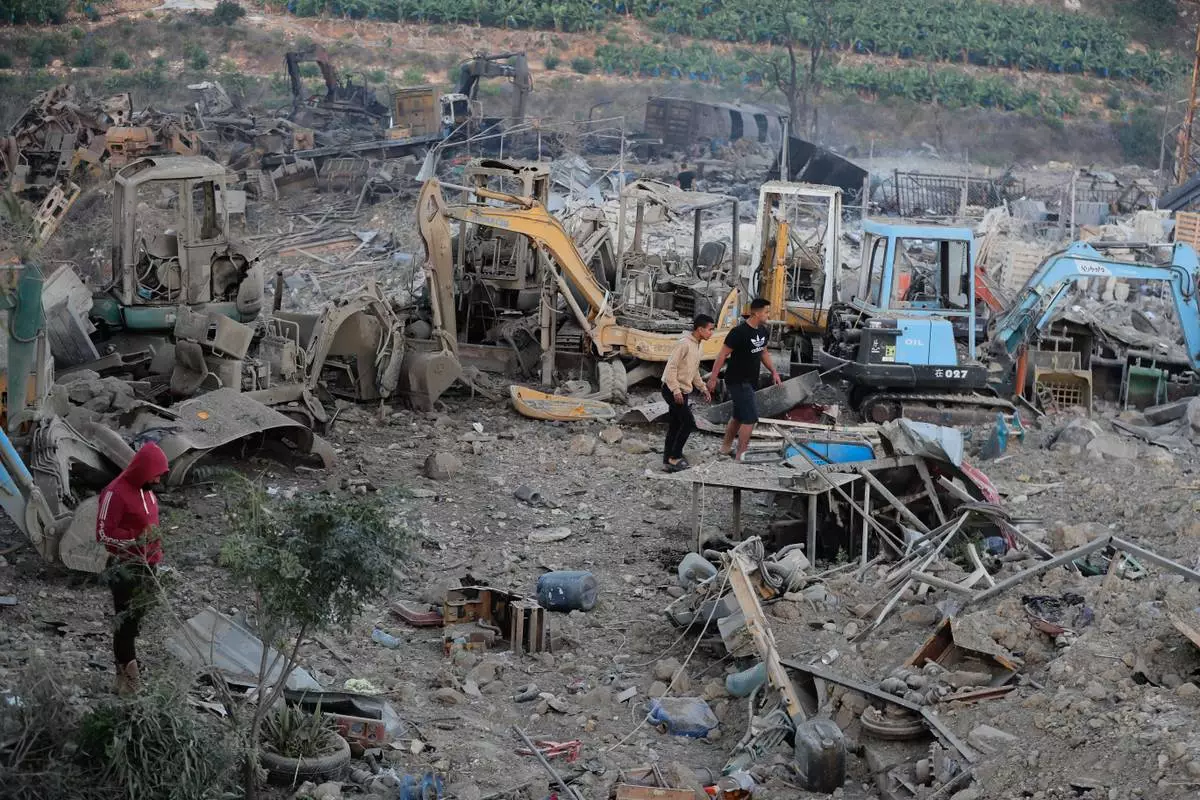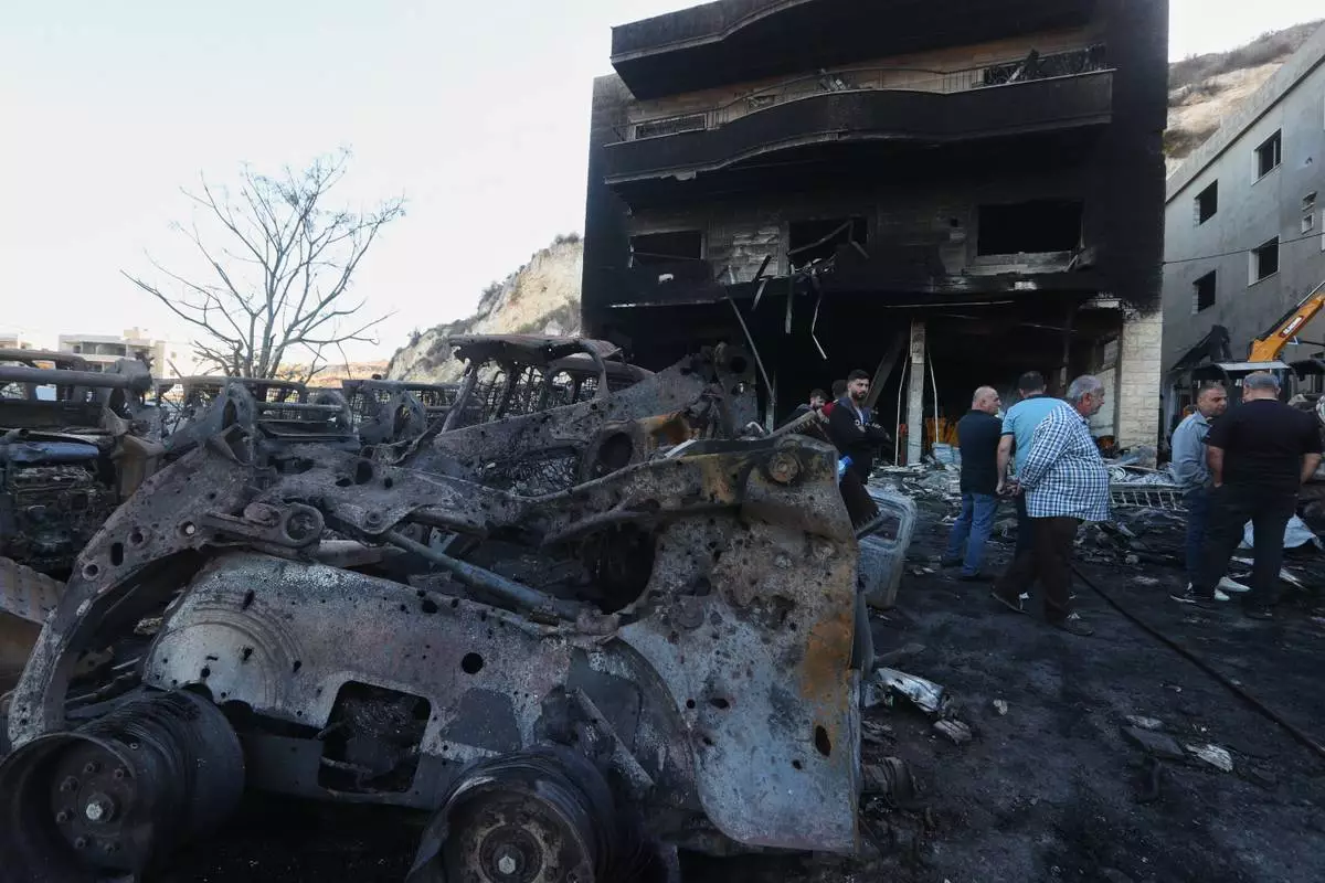 People gather at a site that sold heavy machinery, where a large number of vehicles were destroyed in Israeli airstrikes, in the southern village of Msayleh, Lebanon, Saturday, Oct. 11, 2025. (AP Photo/Mohammed Zaatari)