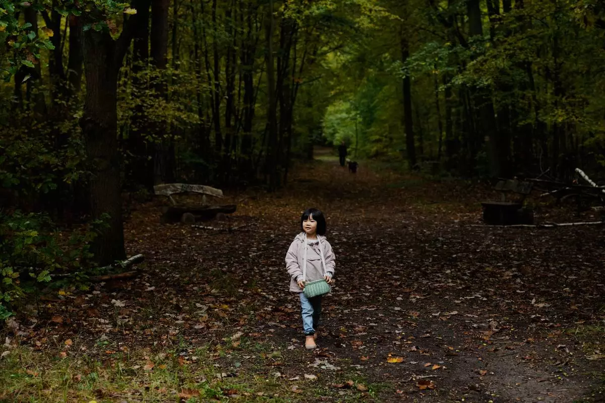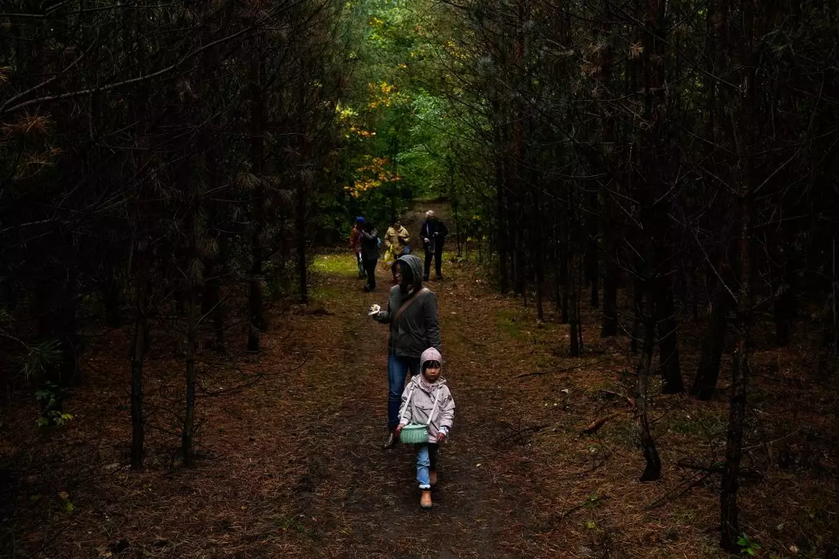 Angela Zhu 5, who is on a mushroom hunting trip with her parents, searches for mushrooms in a forest in Potsdam, Germany, Wednesday, Oct. 8, 2025. (AP Photo/Ebrahim Noroozi)