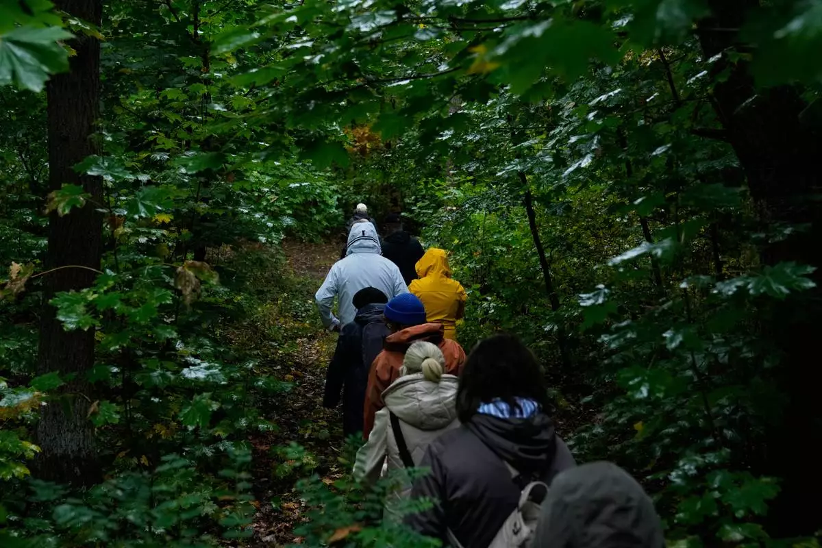Wolfgang Bivour 75, center, a mushroom hunting tour leader, instructs mushroom pickers on how to hunt mushrooms in a forest in Potsdam, Germany, Wednesday, Oct. 8, 2025. (AP Photo/Ebrahim Noroozi)