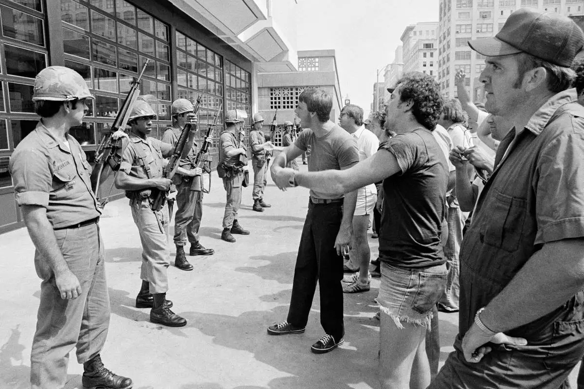 FILE - Striking firefighters yell at working firefighters inside the fire station, as Tennessee National Guard troops guard the front entrance, on Aug. 15, 1978, in downtown Memphis. (AP Photo/Chuck Robinson, File)