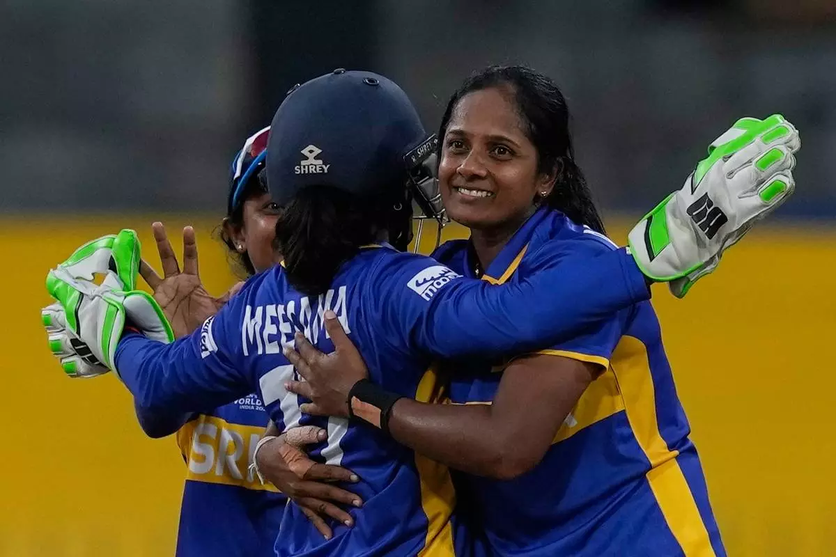 Sri Lanka's Inoka Ranaweera celebrates the wicket of England's Alice Capsey with teammates during the ICC Women's Cricket World Cup match between England and Sri Lanka at Premadasa Stadium in Colombo, Sri Lanka, Saturday, Oct. 11, 2025. (AP Photo/Eranga Jayawardena)