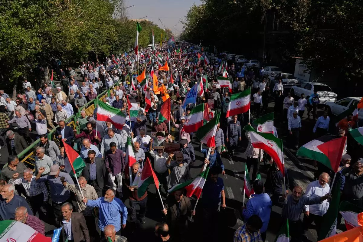 Iranian worshippers hold Iranian and Palestinian flags during an anti-Israeli rally after their Friday prayers at the Enqelab-e-Eslami (Islamic Revolution) street, in Tehran, Iran, Friday, Oct. 10, 2025. (AP Photo/Vahid Salemi)