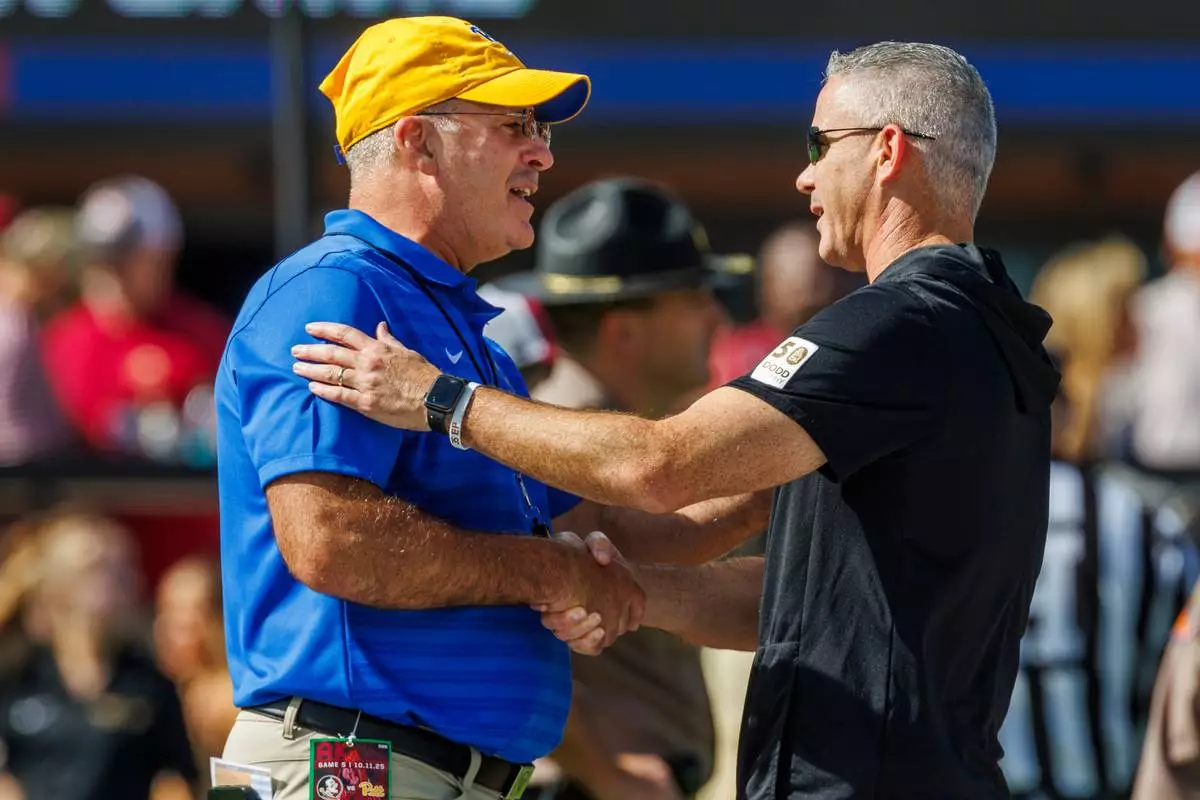 Pittsburgh head coach Pat Narduzzi, left, and Florida State head coach Mike Norvell talk prior to an NCAA college football game, Saturday, Oct. 11, 2025, in Tallahassee, Fla. (AP Photo/Colin Hackley)