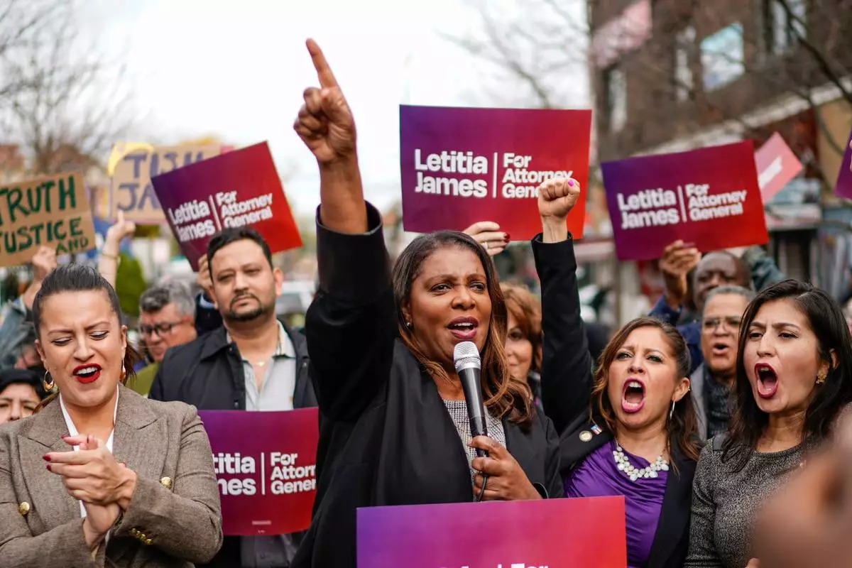 FILE - New York Attorney General Letitia James speaks during a campaign rally with community leaders in the Jackson Heights neighborhood in the Queens borough of New York, Nov. 1, 2022, (AP Photo/Eduardo Munoz Alvarez, File)