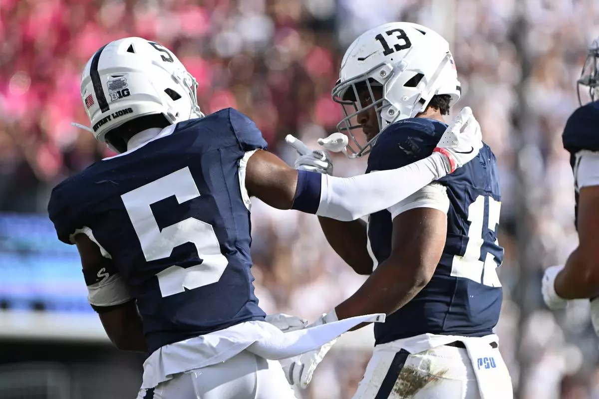 Penn State running back Kaytron Allen (13) celebrates with wide receiver Devonte Ross (5) after scoring a touchdown against Northwestern during the second quarter of an NCAA college football game, Saturday, Oct. 11, 2025, in State College, Pa. (AP Photo/Barry Reeger)