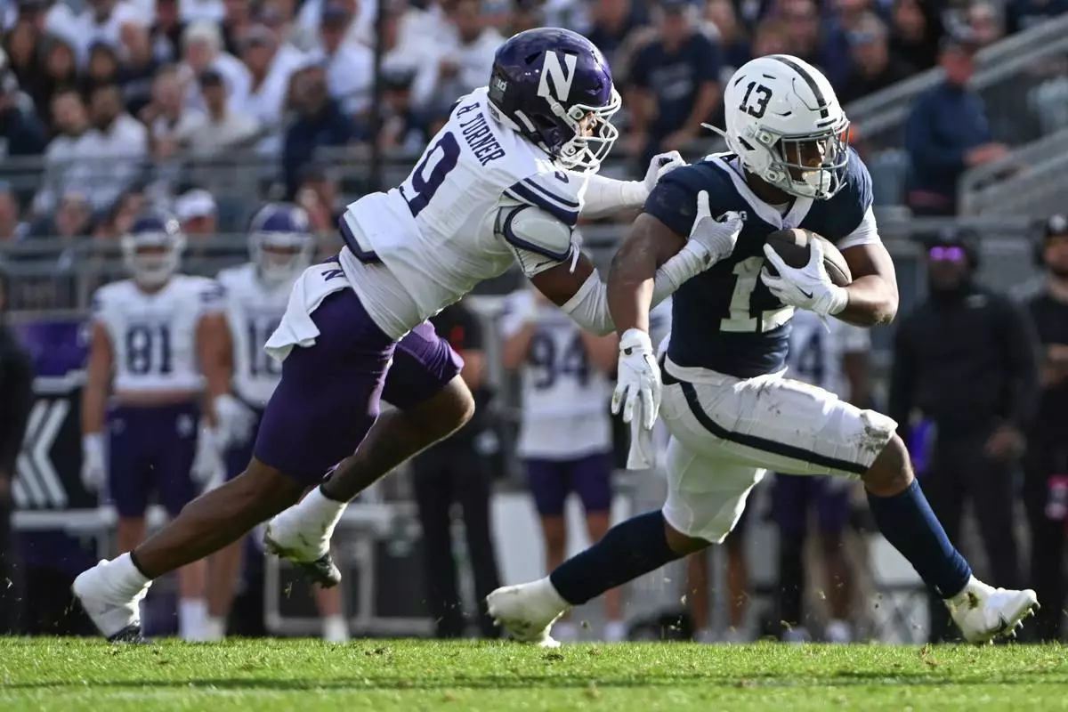 Penn State running back Kaytron Allen (13) runs away from Northwestern defensive back Braden Turner (9) during the second quarter of an NCAA college football game, Saturday, Oct. 11, 2025, in State College, Pa. (AP Photo/Barry Reeger)