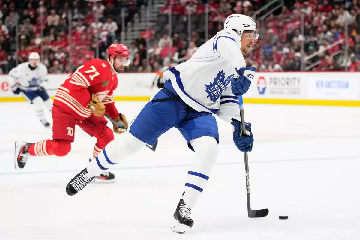 Toronto Maple Leafs center Dakota Joshua, right, shoots near Detroit Red Wings center Dylan Larkin (71) during the first period of an NHL hockey game, Saturday, Oct. 11, 2025, in Detroit. (AP Photo/Ryan Sun)