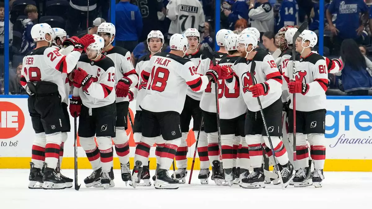 New Jersey Devils players celebratre after defeating the Tampa Bay Lightning during an NHL hockey game Saturday, Oct. 11, 2025, in Tampa, Fla. (AP Photo/Chris O'Meara)