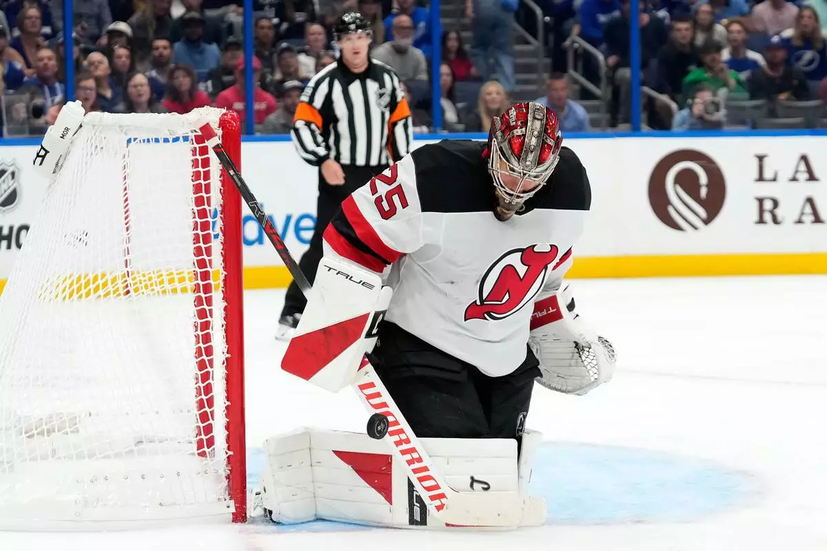 New Jersey Devils goaltender Jacob Markstrom (25) makes a save on a shot by the Tampa Bay Lightning during the second period of an NHL hockey game Saturday, Oct. 11, 2025, in Tampa, Fla. (AP Photo/Chris O'Meara)