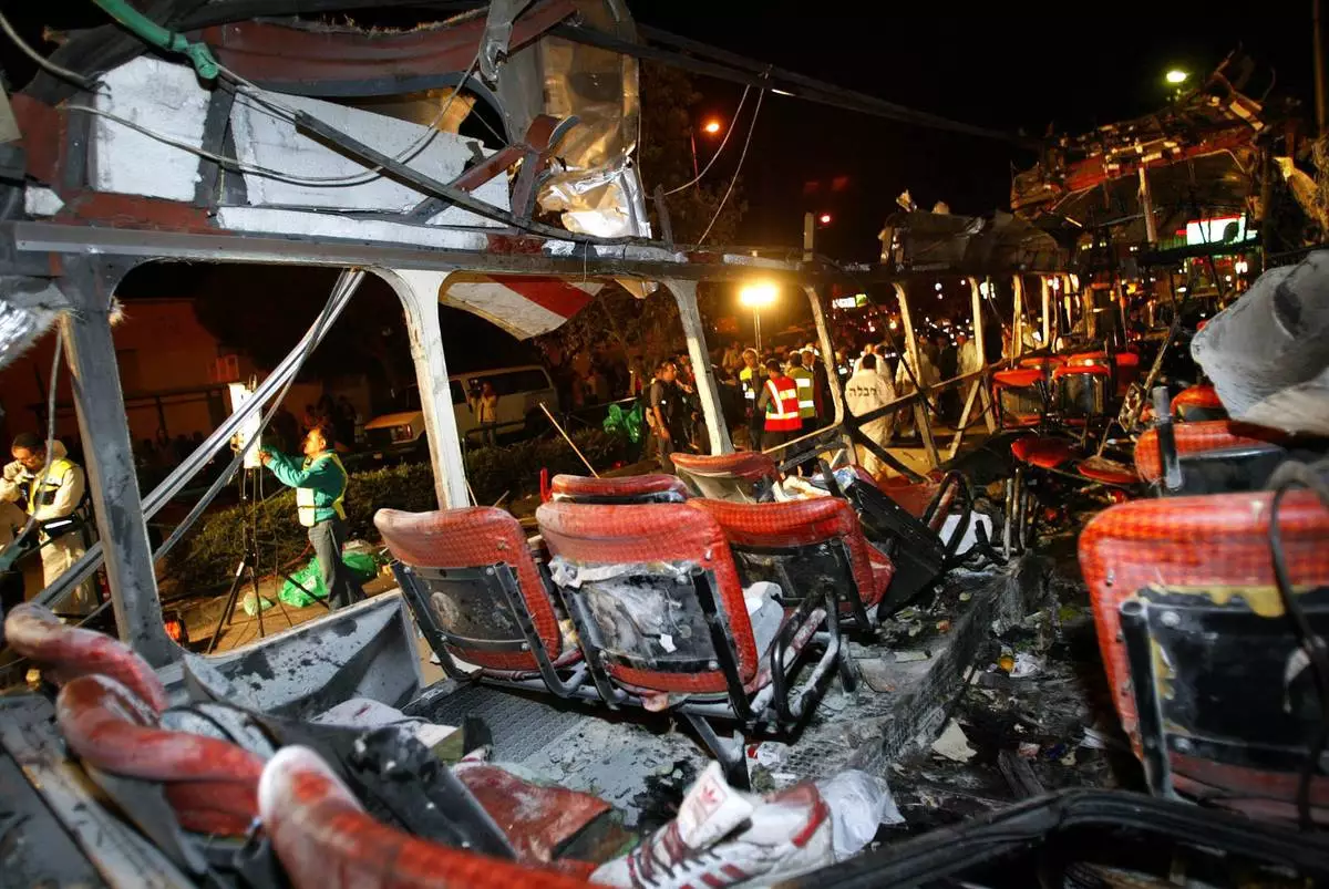 FILE - Police forensic officers work amid the remains of a bombed bus in the northern Israeli city of Haifa Wednesday, March 5, 2003. (AP Photo/Brennan Linsley, File)